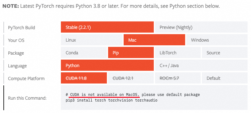 需要注意的是,MBP M 芯片系列的电脑,计算平台中 CUDA 会被画横线,不能选择,如果强行选择则不能安装。