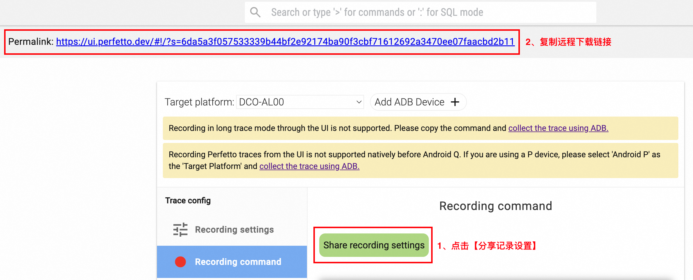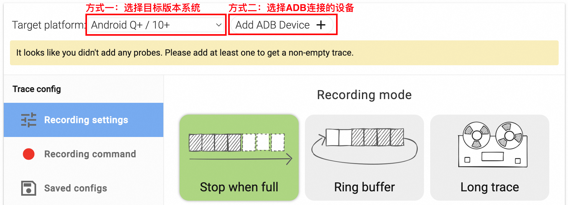 第一步,选择目标 Android 设备系统版本。打开 Perfetto UI,选择要抓 Trace 的目标设备,有 2 种方式,如图一所示: