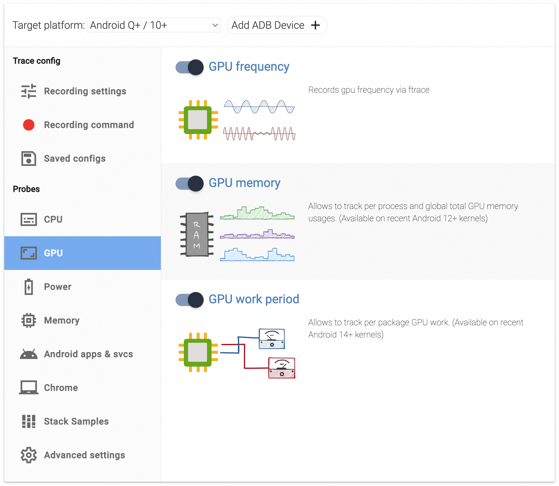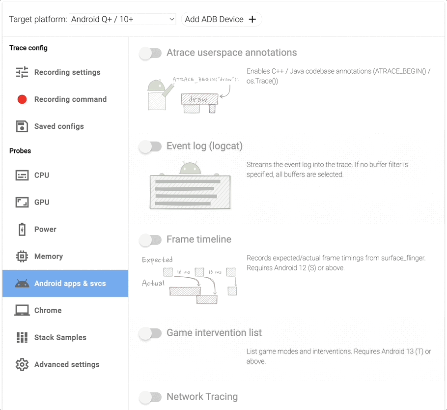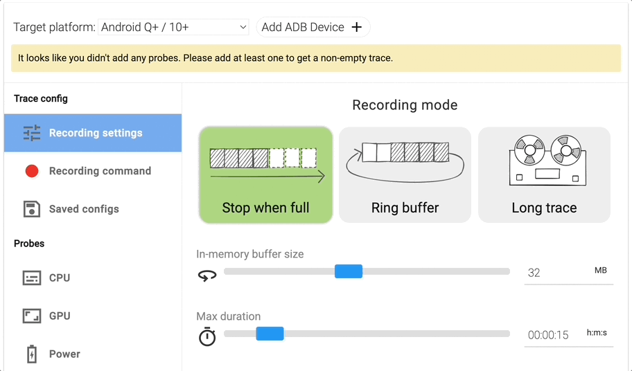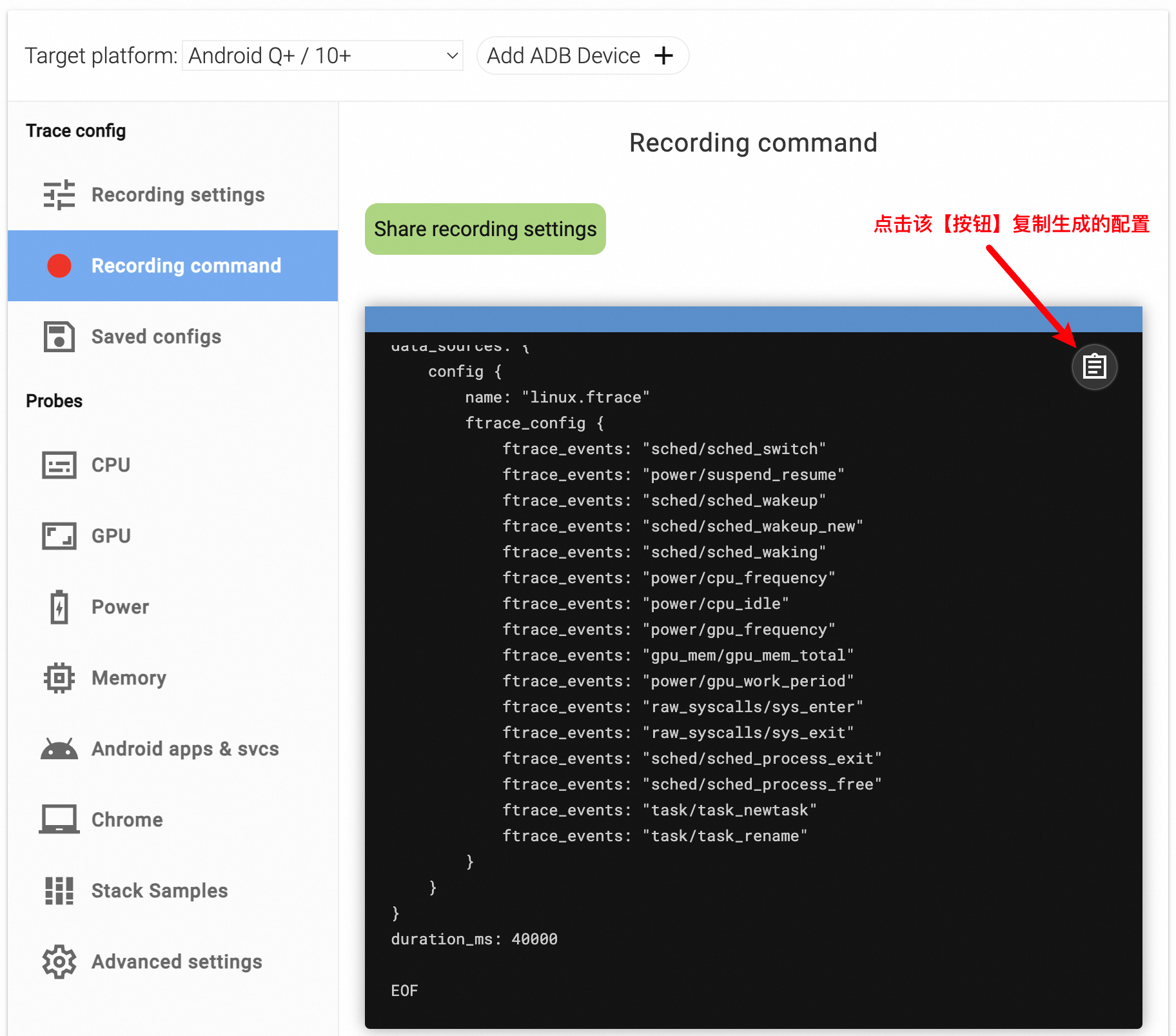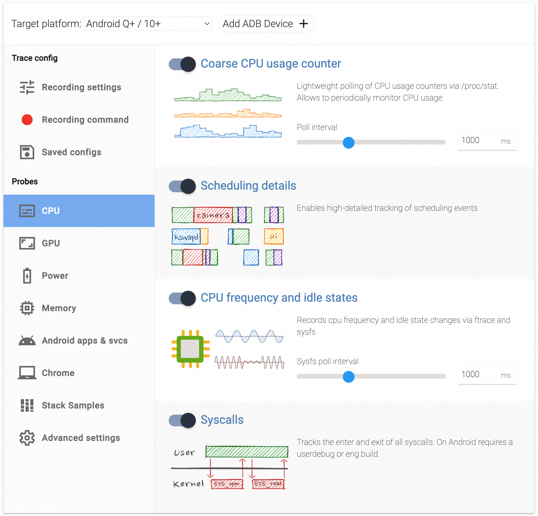 我们在抓 Trace 的时候可以指定应用、内存、CPU、GPU、电源和系统事件等,使用 Perfetto 时可以使用 PerfettoUI 来生成配置:https://ui.perfetto.dev/#!/record。