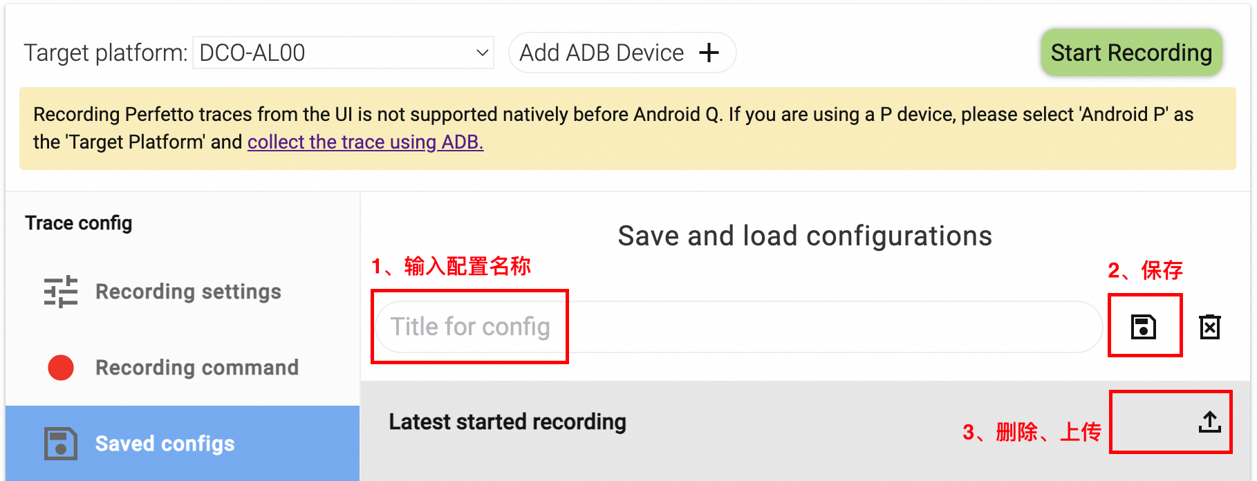 使用 Perfetto UI 抓取 Trace 时,选择目标 Android 设备系统版本时,需要选择 ADB 连接的设备,在 Perfetto UI 上配置完成后,不用保存到本地,直接点击【Start Recording】开始录制,如图十所示: