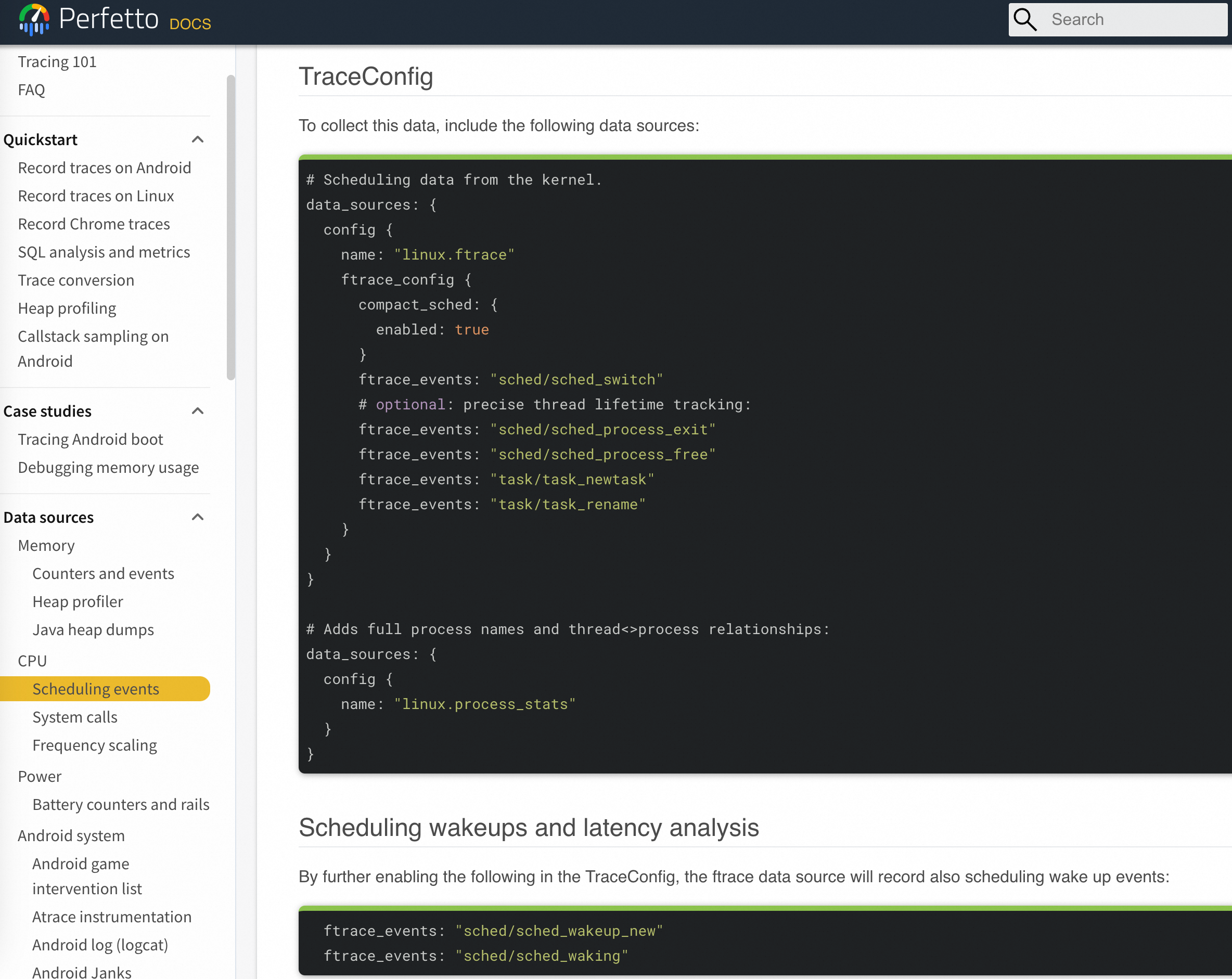 在实际操作中,会根据不同的场景和需求对抓 Trace 的配置文件做修改,如何修改可以参考官网文档(https://perfetto.dev/docs/)数据源配置,文档位置如图九所示: