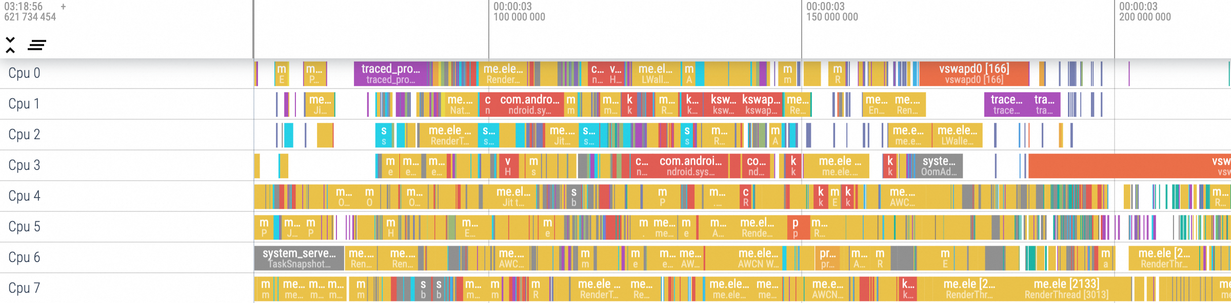 (图一)可以看到我这个手机有 8 个 CPU,其中 CPU7 看起来是最繁忙的,在这个手机上,它是唯一的大核 CPU,也是 main 线程所绑定的 CPU。