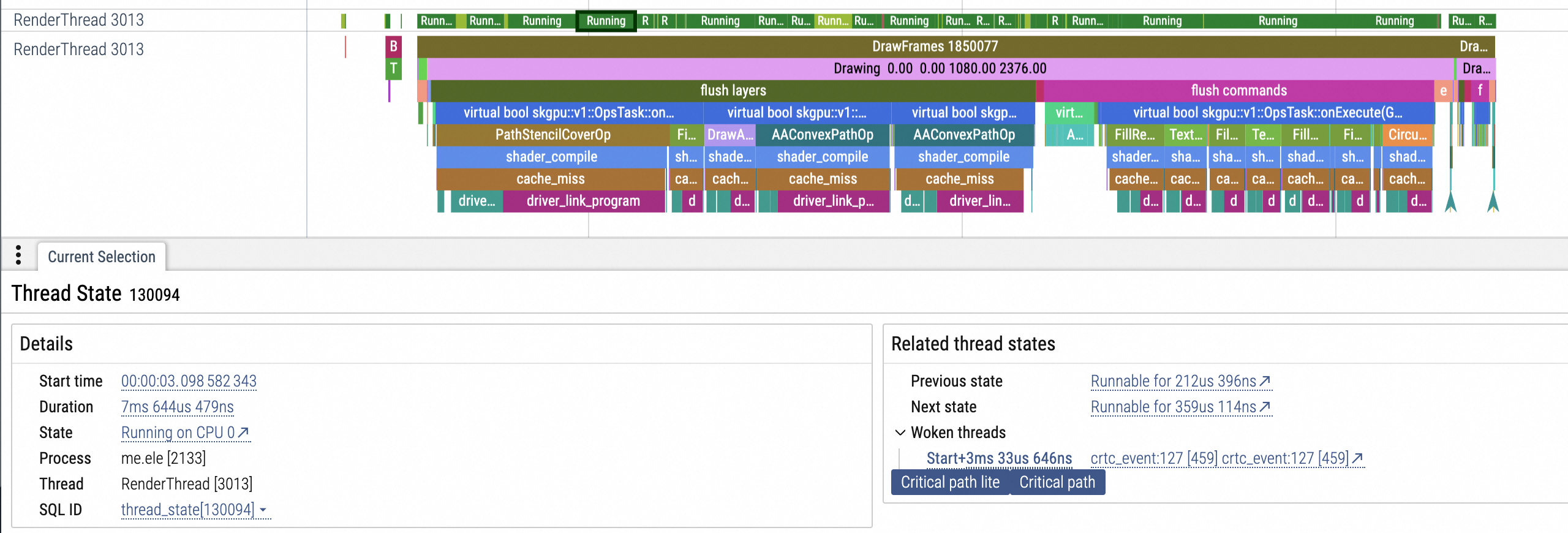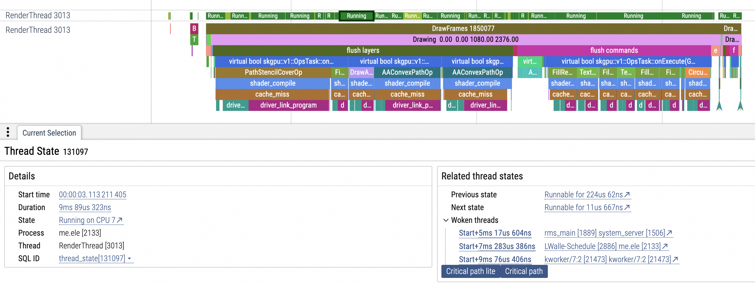 职责不同:main 线程是 Android 应用程序的主入口点,负责处理用户输入、事件分发和 UI 更新等任务。它是应用程序的核心线程,负责执行应用程序的主要逻辑。RenderThread 则专注于处理 View 的渲染工作,减轻主线程的负担,提高渲染效率和流畅度。 并行处理:main 线程通常是顺序执行任务的,而 RenderThread 可以并行处理多个 View 的渲染任务。这意味着即使某个 View 的渲染任务比较复杂或耗时较长,也不会阻塞其他 View 的渲染或主线程的执行。 硬件加速:RenderThread 利用 GPU 进行硬件加速渲染,能够显著提高渲染速度和效率。而 main 线程则不直接参与硬件加速渲染过程。 交互方式:main 线程与 RenderThread 之间通过特定的接口和机制进行交互。例如,主线程可以通过提交渲染任务给 RenderThread 来触发渲染操作,而 RenderThread 则可以通过回调等方式将渲染结果通知给主线程。 3.2、RenderThread 默认未绑定 CPU 回到主题,我们来观察 RenderThread 运行在哪个 CPU 上,找到应用的 RenderThread,并在 RenderThread status 横轴找到相对比较繁忙的阶段,选中 Running 阶段,如图三所示它运行在CPU 0