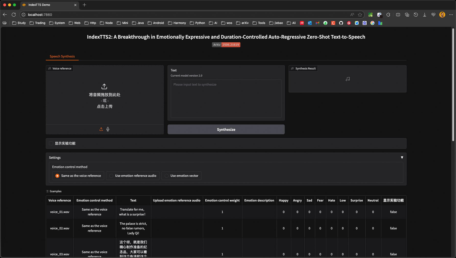 Looking in indexes: https://mirrors.aliyun.com/pypi/simple/, https://pypi.tuna.tsinghua.edu.cn/simple/, https://mirrors.ustc.edu.cn/pypi/simple/, https://pypi.org/simple/ Collecting protobuf==3.20.3 ... modelscope - INFO - Got n files, start to download ... ... modelscope - INFO - Download model 'IndexTeam/IndexTTS-2' successfully. ---model_id--- nvidia/bigvgan_v2_22khz_80band_256x Loading weights from nv-community/bigvgan_v2_22khz_80band_256x Removing weight norm... >> bigvgan weights restored from: nvidia/bigvgan_v2_22khz_80band_256x >> TextNormalizer loaded >> bpe model loaded from: ./checkpoints/bpe.model * Running on local URL: http://192.168.1.3:7860 * To create a public link, set `share=True` in `launch()`.